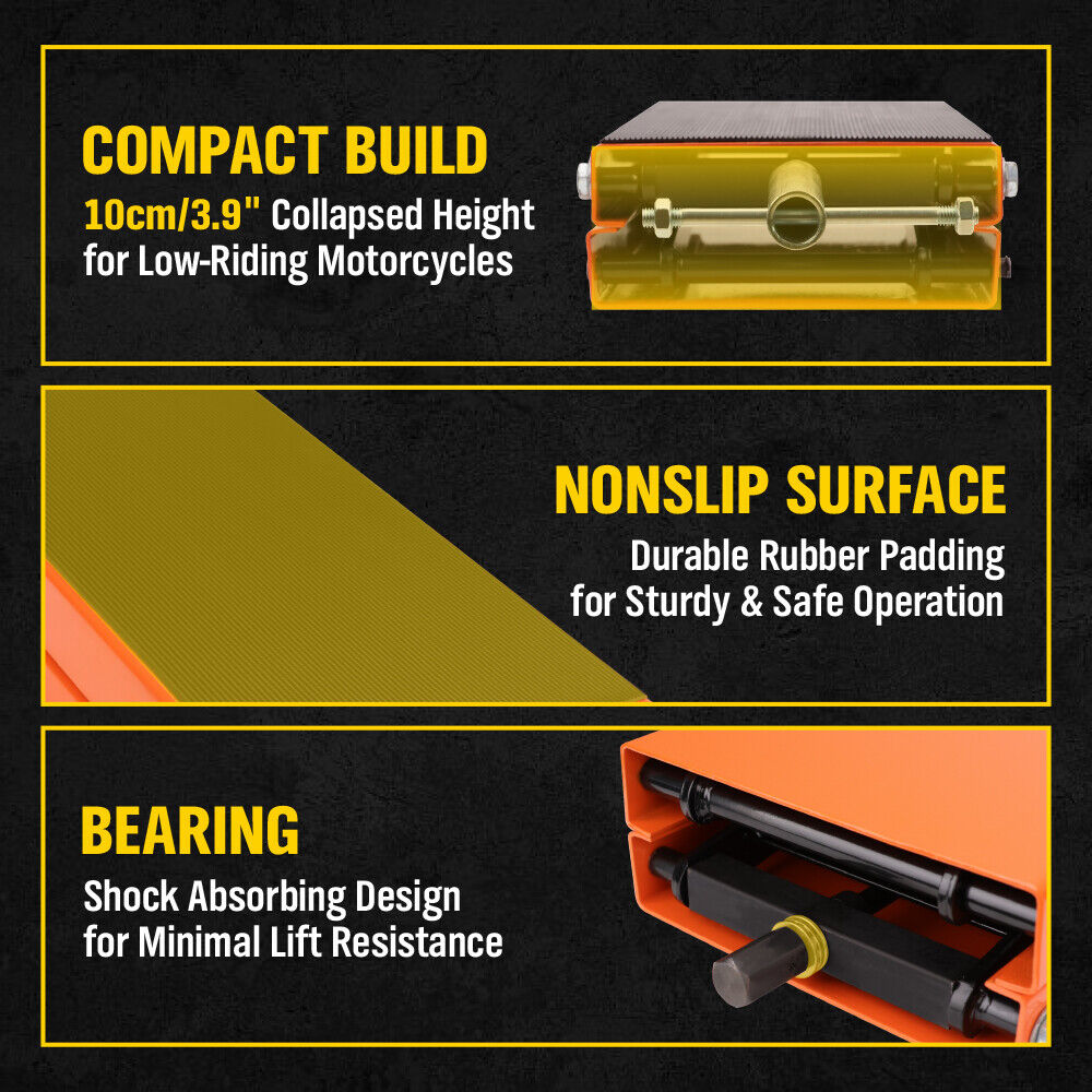 - Non-slip Wide Deck: You don't like your motorcycle shaking and sliding on the small platform during lifting, do you? Our 14.4" x 9" extra-wide top platform provides a large contact area. And a durable rubber pad with a striped pattern prevents slipping and protects your motorcycle from scratches.